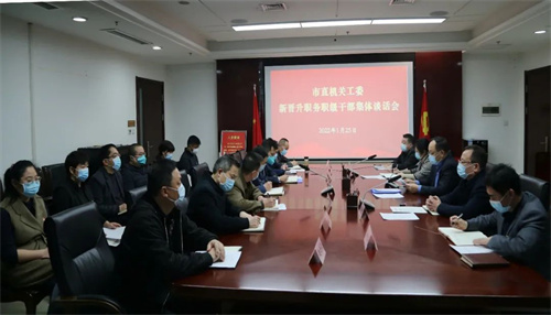 1月25日上午,市直机关工委召开新晋升职务职级干部任前集体谈话会。市直机关工委常务副书记苏俊良主持并作集体谈话。委领导刘培宏、白望绪,工委组织部、纪检监察工委机关负责同志,机关新晋升职务职级13名干部参加。