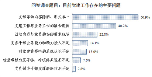 (一)组织生活形式、内容单一。问卷调查中发现,党员反映党建工作存在的最主要问题是支部活动内容陈旧、形式单一,选择比例达60.9%,位列第一(图4)。从我们对支部日常工作的了解情况看,传达学习重要讲话、会议精神是目前支部活动的主要内容,载体较为单一,内容缺少个性特点,没有与业务实际和党员需求相结合,一定程度上减弱了组织生活对党员的吸引力。
