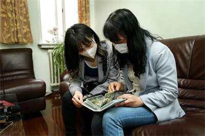 李钊的妻子(右)翻看相册向记者回忆和李钊在一起的旧日时光