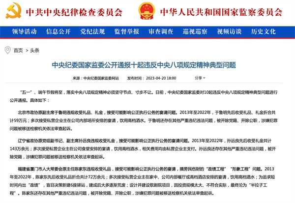 日前,中央纪委国家监委公开通报10起违反中央八项规定精神典型问题。案例聚焦违规收受礼品礼金、违规接受宴请和旅游安排等现象,突出“关键少数”,释放出纪检监察机关紧盯关键节点、关键问题从严纠治,对顶风违纪的,不论职务高低一律从严查处、寸步不让的强烈信号。