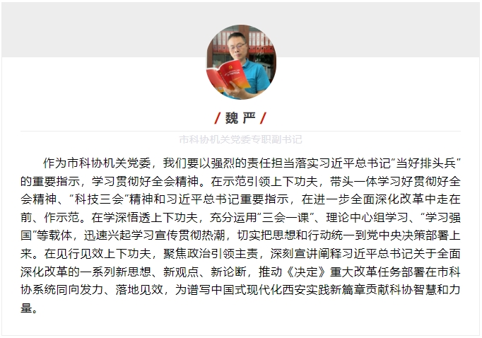 近期,市直机关党组织采取多种形式,迅速掀起学习贯彻全会精神热潮。市直机关工委在西安机关党建微信公众号特别开设“市直机关党员干部热学热议党的二十届三中全会精神”专栏,积极展示机关党员干部学习贯彻全会精神感言感悟,努力营造学习宣传贯彻全会精神的浓厚氛围,进一步推动学习宣传贯彻全会精神持续深入,为奋力谱写中国式现代化西安实践新篇章凝聚力量。