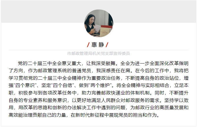 近期,市直机关党组织采取多种形式,迅速掀起学习贯彻全会精神热潮。市直机关工委在西安机关党建微信公众号特别开设“市直机关党员干部热学热议党的二十届三中全会精神”专栏,积极展示机关党员干部学习贯彻全会精神感言感悟,努力营造学习宣传贯彻全会精神的浓厚氛围,进一步推动学习宣传贯彻全会精神持续深入,为奋力谱写中国式现代化西安实践新篇章凝聚力量。