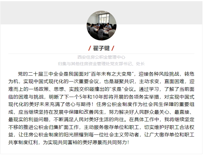 近期,市直机关党组织采取多种形式,迅速掀起学习贯彻全会精神热潮。市直机关工委在西安机关党建微信公众号特别开设“市直机关党员干部热学热议党的二十届三中全会精神”专栏,积极展示机关党员干部学习贯彻全会精神感言感悟,努力营造学习宣传贯彻全会精神的浓厚氛围,进一步推动学习宣传贯彻全会精神持续深入,为奋力谱写中国式现代化西安实践新篇章凝聚力量。