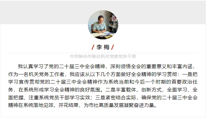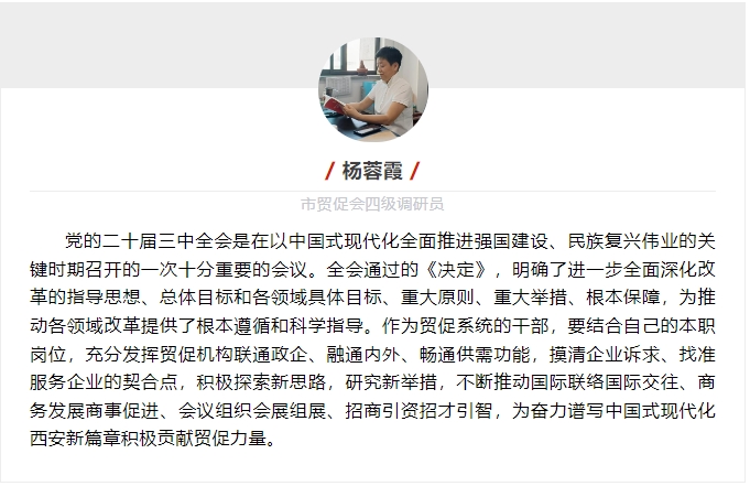 近期,市直机关党组织采取多种形式,迅速掀起学习贯彻全会精神热潮。市直机关工委在西安机关党建微信公众号特别开设“市直机关党员干部热学热议党的二十届三中全会精神”专栏,积极展示机关党员干部学习贯彻全会精神感言感悟,努力营造学习宣传贯彻全会精神的浓厚氛围,进一步推动学习宣传贯彻全会精神持续深入,为奋力谱写中国式现代化西安实践新篇章凝聚力量。